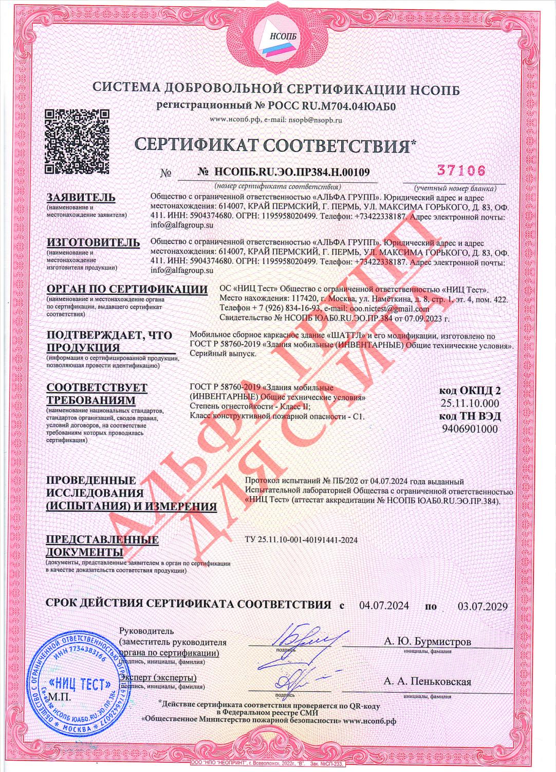 Протокол испытаний пожарной безопасности капсульный дом ШАТТЛ